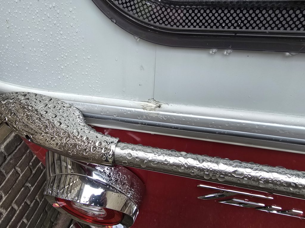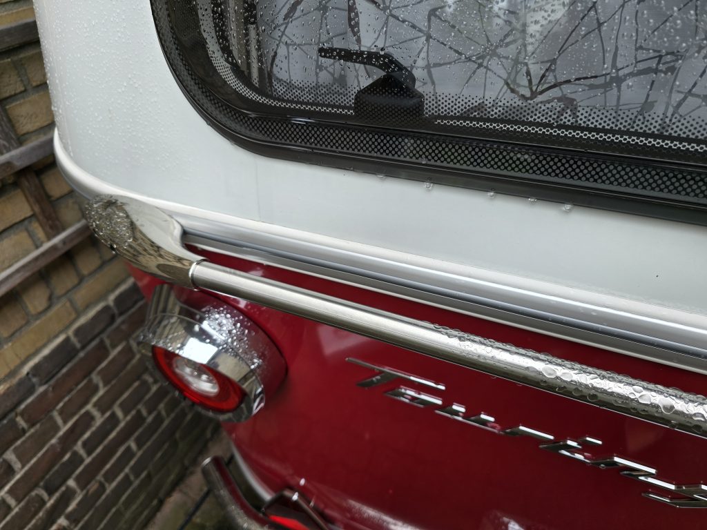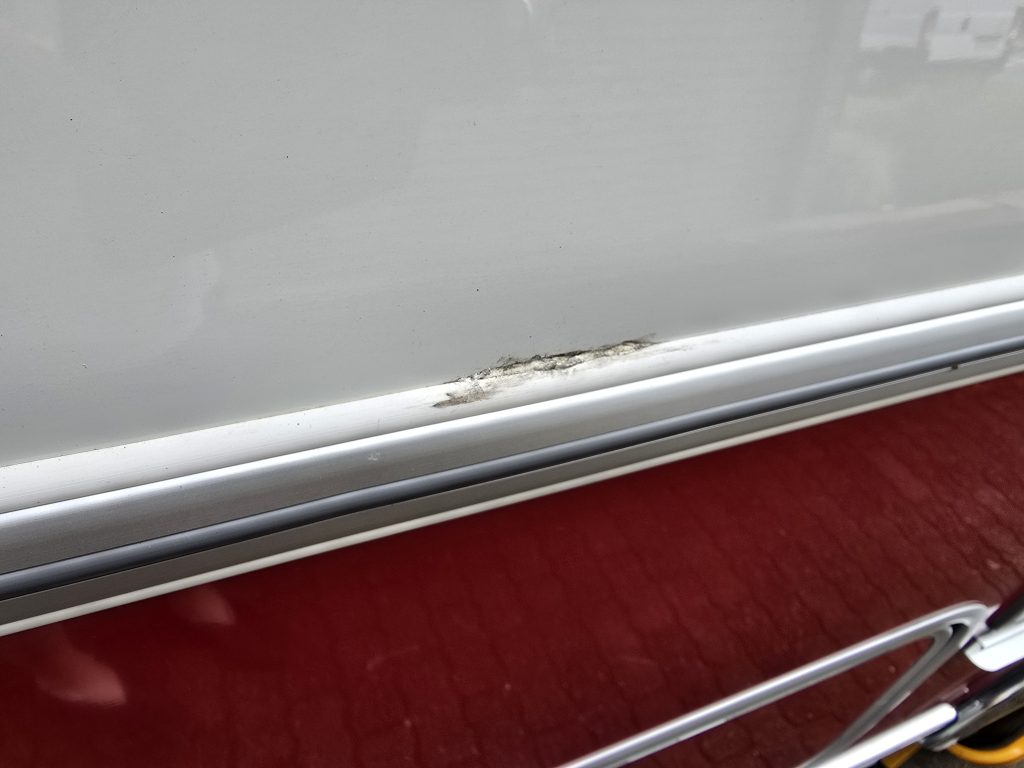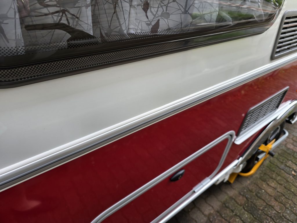 Op de strip aan de buitenkant van onze nieuwe Eriba Touring zaten nog kitresten die er lelijk uitzagen omdat ze zwart vuil aantrekken. Nu hadden we al eens eerder gezien en gelezen dat de kit rond de randen er soms blijft uitkomen. Vooral als de caravan vol in de zon blijft staan. Het blijkt heel makkelijk om deze kit veilig te verwijderen zonder dat de lak wordt aangetast.